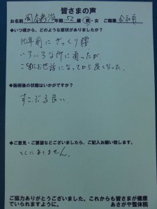 みなさまの声大変気持ち良かった 2013年11月15日 あさがや 整体院 【阿佐ヶ谷の整体】土日、祝日も営業!マッサージ師も通うあさがや整体院 お名前 K.K 様 年齢 75歳 女性 ご職業 主婦 いつ頃から、どのような症状がありましたか? しばらく前から少し肩が痛かった。 施術後の状態はいか …