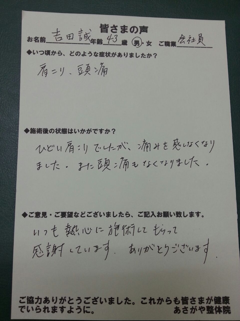 慢性的な肩こりから頭痛もあったのですが、軽減されてよかったですね。